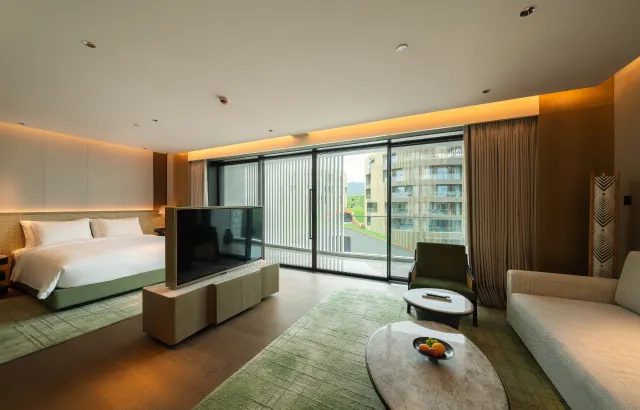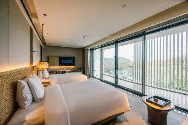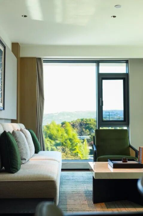 推窗即景,客房均拥有极佳的观景视角,或面向私密庭园,或远眺绵延竹海。超大的落地窗如同一幅巨大的画框,将四季流转的风景定格。